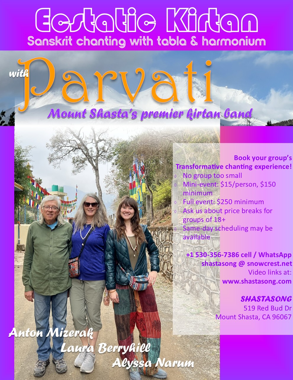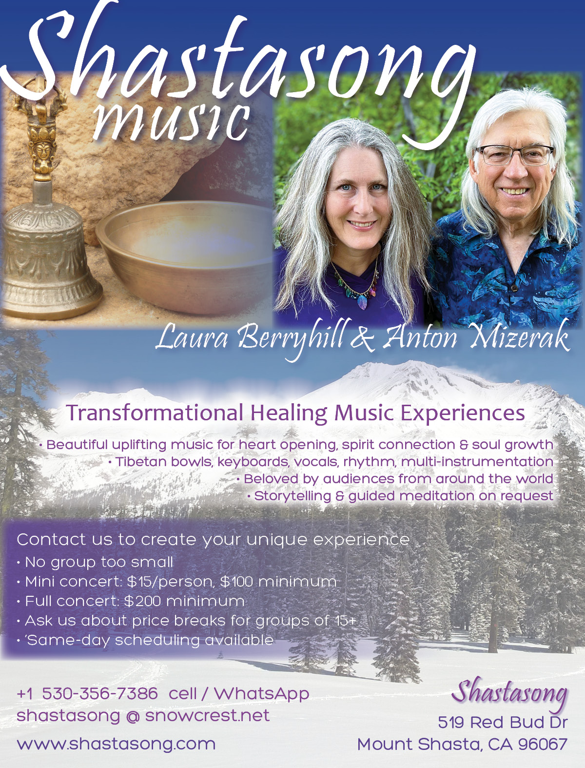 Mount Shasta Transformational Music Concerts Anton Mizerak and tour partner Laura Berryhill offer a series of intimate transformational healing music concerts at their Shastasong Events Studio on the side of majestic Mount Shasta. Admission is by donation. We are available to play concerts on most days of the year. We also host foreign and domestic tour groups. We have hosted groups from Taiwan, Hong Kong, Japan, Germany, Belgium, Finland, Quebec, Mexico, Costa Rica, Brazil and Argentina. Check out our group photo gallery and testimonial pages. Our studio seats thirty three guests. Private concerts can also be booked by emailing us:anton@shastasong.com or by phone: 530-926-3740 or text 530-356-7386.